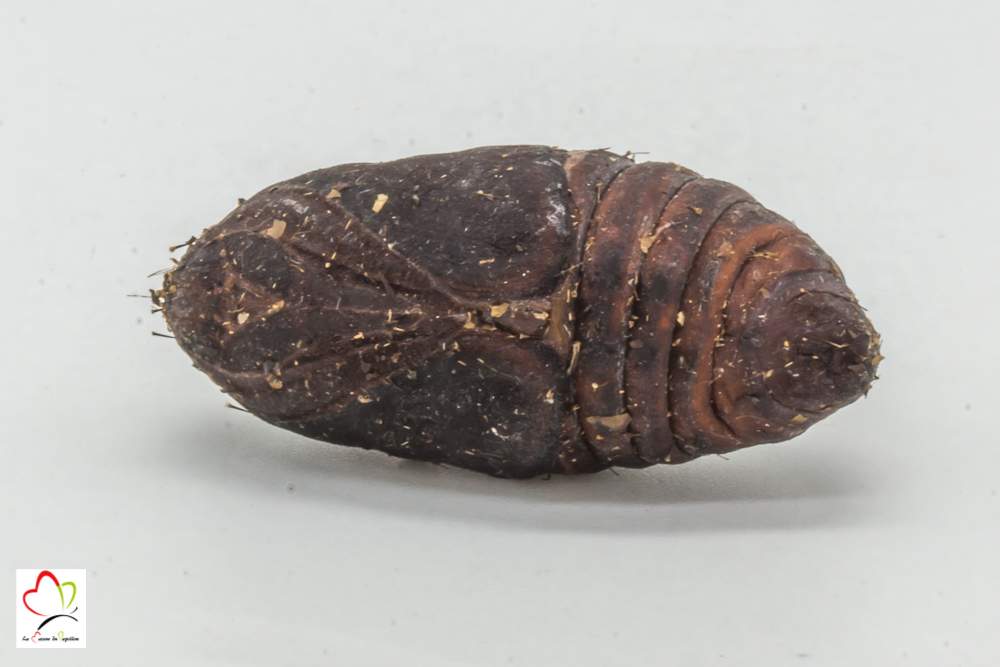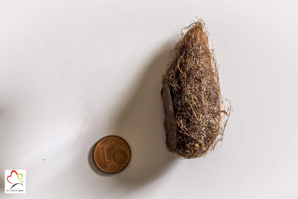 Le cocon a une forme oblongue avec un côté rond et un côté pointu. C’est par celui-ci que sortira le papillon.