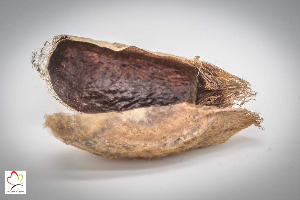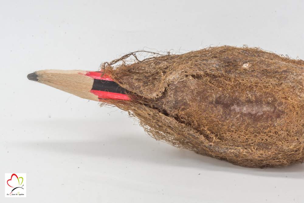 Voici une coupe (c’est extrêmement solide et difficile à couper). La chrysalide possède de nombreux trous d’aération qui lui permettent de respirer.