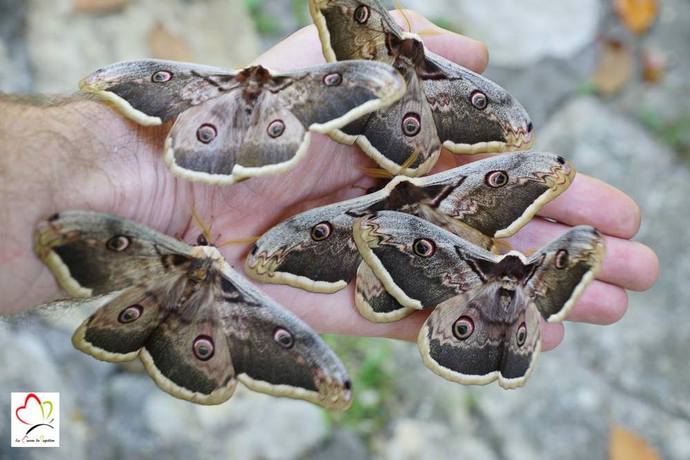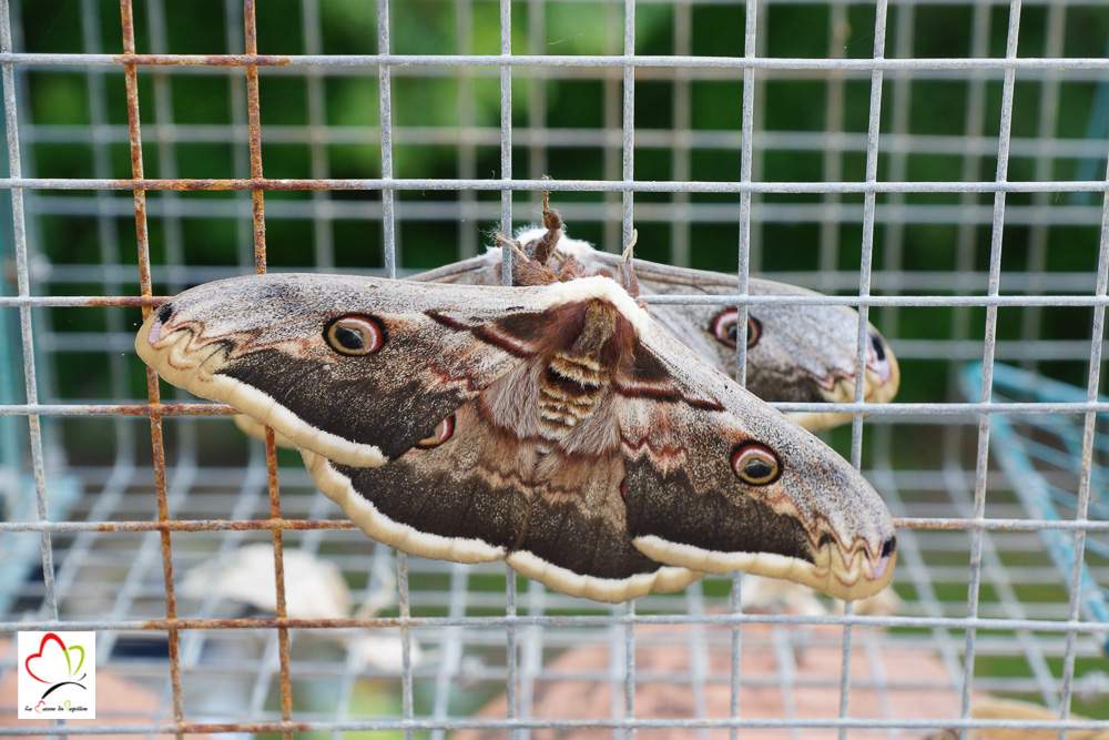 En les chassant je découvrit , une Grand Paon de Nuit. Grâce à certains sites dont le vôtre -Maison du papillon 🦋 ; -Nature en Périgord… J’ ai pu découvrir que c’était une femelle. Je ne connaissais pas ce papillon 🦋 Pour la sauvegarder , je l’installe dans un vivarium avec tout ce dont – elle a besoin pour reprendre des forces.