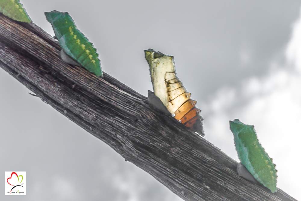 - Si une chrysalide venait à se détacher, on peut la coller avec une colle alimentaire utilisée en pâtisserie ou un mastic acrylique.